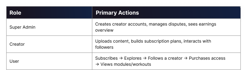 If a user likes a particular trainer, they can purchase a specific subscription plan to unlock all exclusive content from that creator—like exercise videos, structured modules, and meal plans. Content Access and Progress Tracking: