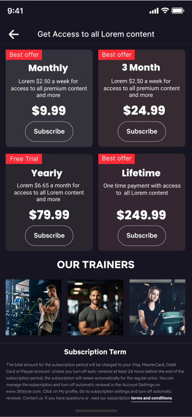 Every user begins by subscribing to the platform. This base subscription gives them access to browse all trainers and preview their free content.